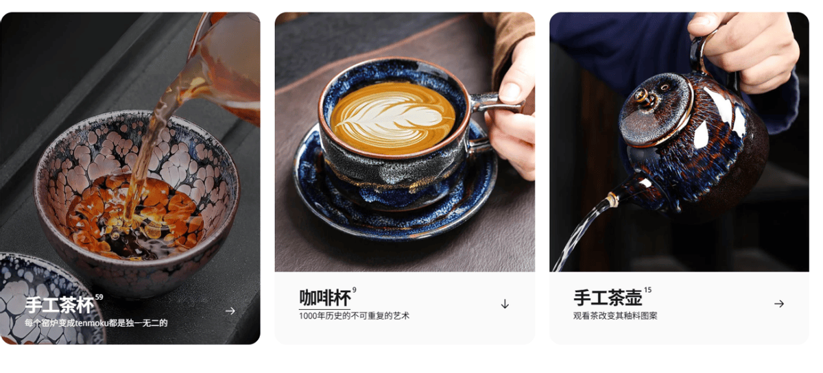 现代瓷器品牌Tenmoku正是抓住了文化传承这一卖点,将传统建盏工艺与现代美学相融合。产品采用100%食品级矿物釉,呈现独特纹理并随使用产生变化,兼具优良保温性。Tenmoku不仅适合茶道爱好者日常使用,其手工釉彩与文化包装也使之成为具有东方匠人精神的收藏级礼品。